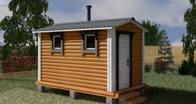Перевозная баня с усиленным металлическим каркасом. Такой каркас придает постройке прочность и надежность. Средний эксплуатационный срок без капитального ремонта достигает 25 лет. Такая баня будет комфортной и экологичной. Она быстро прогревается и хорошо держит тепло, что сильно уменьшит денежные траты на топливо.