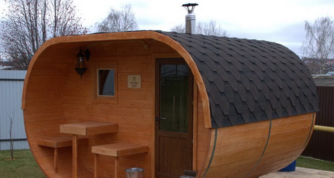 Мобильная бочка-баня. Это цилиндрическая конструкция с торцами в виде круга или овала. Торцы соединены досками, которые, в свою очередь, стягиваются металлическими обручами. Крайне важно, чтобы бочка не пропускала влагу. Доски должны быть качественно обработаны и подогнаны друг под друга. В производстве таких бань есть много различных нюансов, потому покупать их нужно только у проверенных профессионалов, чтобы не пожалеть о покупке. Диаметр таких бань обычно в пределах 2,5 м, а длина может достигать и 6 м.