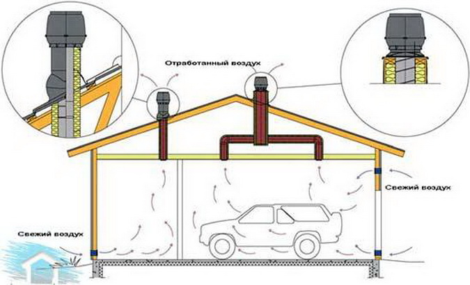 Вентиляция. Если гараж не отапливается вовсе или обогревается периодически, важно позаботиться об устройстве системы естественной вентиляции. Она самая простая и малозатратная, но имеет существенный недостаток — ее устойчивая работа обусловлена переменными факторами: температурой воздуха, направлением и скоростью ветра.