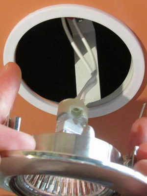 При необходимости ремонт и замена точечного светильника или просто смена лампочки в нем не составят никакого труда. Главное, при смене светоприбора следить за тем, чтобы провода не нырнули в отверстие. Достать их оттуда, не разбирая конструкцию, будет затруднительно.