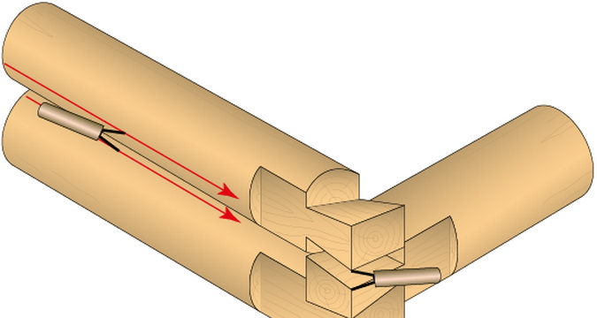 Шипы устанавливают на расстоянии 1,5-2 м друг от друга. От угла стен отступают 20-25 см и вбивают первый шип. Он не должен упираться в дно гнезда, иначе станет мешать нормальной осадке сруба. Поэтому гнезда для шипов делают на 8-10 мм длиннее самого шипа. Нагели забивают кувалдой, не доводя до дна гнезда. По такой схеме собирают все венцы сруба.