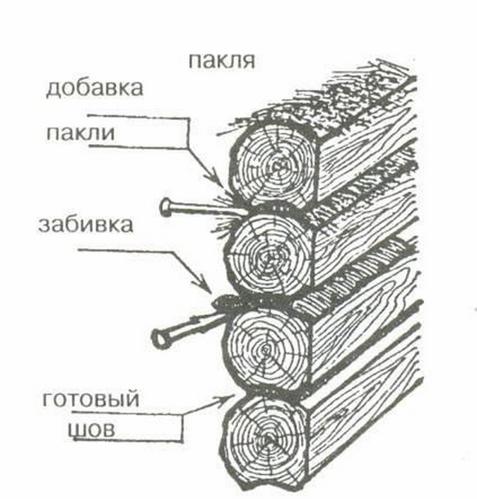 Уплотнительные материалы выкладывают ровным слоем по всей длине бревна и в плоскости врубки. Толщина слоя должна быть не менее 5 см. Пазы верхнего бревна совмещают с пазами нижнего и загоняют друг в друга кувалдой или деревянной чуркой.