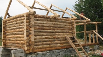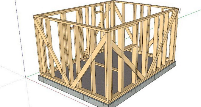 При строительстве такой бани каркасные рамы своими руками собирают рядом с местом их установки. Стойки делают из бревен или брусьев сечением от 80 X 80 до 120 X 120 мм. Расстояния между стойками оставляют от 80 до 110 см. Столбы закрепляют в пазы обвязки или фиксируют нагелями. Затем столбы укрепляют деревянными раскосами, которые приколачивают гвоздями. Для угловых стоек требуются два раскоса.