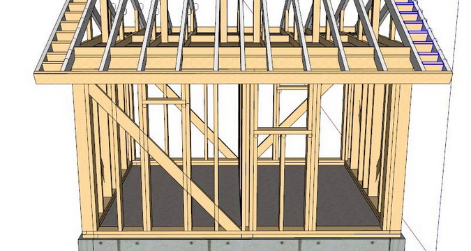 Рама должна быть строго прямоугольной формы. Поэтому после сборки форму рамы проверяют, измеряя ее диагонали. Затем скрепляют раму временными раскосами. Они должны соединять обвязку и стойки, но не выпирать за пределы контура рамы, чтобы не мешать при дальнейшем монтаже.