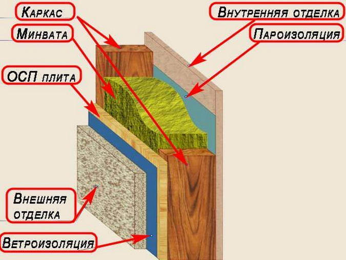 Готовый каркас обивают обшивочными досками внутри и снаружи. Между обшивками закладывают теплоизоляционный материал. Обе работы ведутся параллельно: утеплитель закладывают по мере набивания на каркас досок.