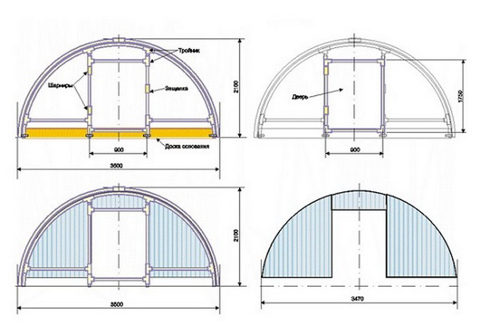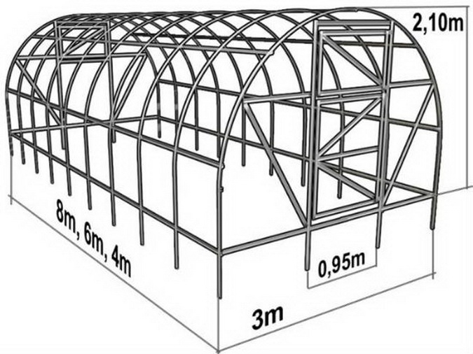 Стремянка После создания фундамента и возведения арки устанавливают торцевые рамы, а потом переходят к натягиванию плёнки и установки двери. Подробно все этапы работ описаны на этой странице.