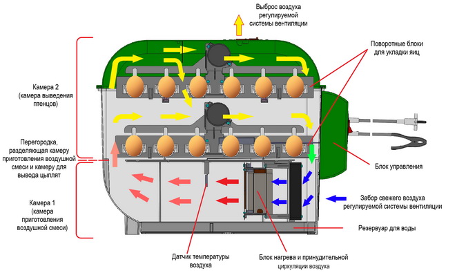 В первой камере размещаются блок питания и управления, привод механизма поворота яиц. Вторая камера является инкубационной, содержит лотки для яиц, поддон для воды, нагревательные элементы и вентилятор. Третья камера выполняет функцию выгульного дворика, является раскладной и предназначена для содержания выведенного молодняка птицы. Она представляет собой состоящий из двух половинок ящик, в разложенном виде размещаемый в нижней части инкубатора, в полу которого уложены пленочные нагревательные элементы. Вторая камера имеет термоизоляционную обшивку. Для поступления свежего воздуха передняя часть первой камеры выполнена в виде решетки и в стенке между первой и второй камерами имеется регулируемое с помощью задвижки отверстие. В дверце с противоположной стороны имеется отверстие для выброса из второй камеры отработанного воздуха.