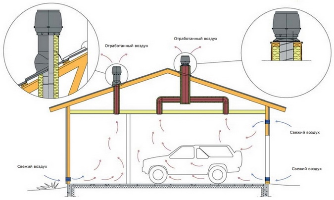 Если установить в гараже вытяжной вентилятор, получим комбинированную систему вентиляции. Его монтируют в стену или воздуховод, проходящий через крышу гаража.