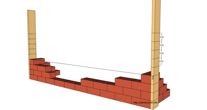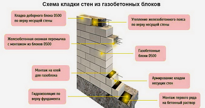 Перед укладкой нужно смочить блок водой. Горизонтальность ряда контролируют шнуром, натянутым между рейками-порядовками. Толщина шва должна составлять 1—1,5 сантиметра. Необходимо обеспечить перевязку (перекрытие) швов. Если в дальнейшем предполагается штукатурить стены, оставляют швы снаружи незаполненными на глубину около 10 миллиметров.