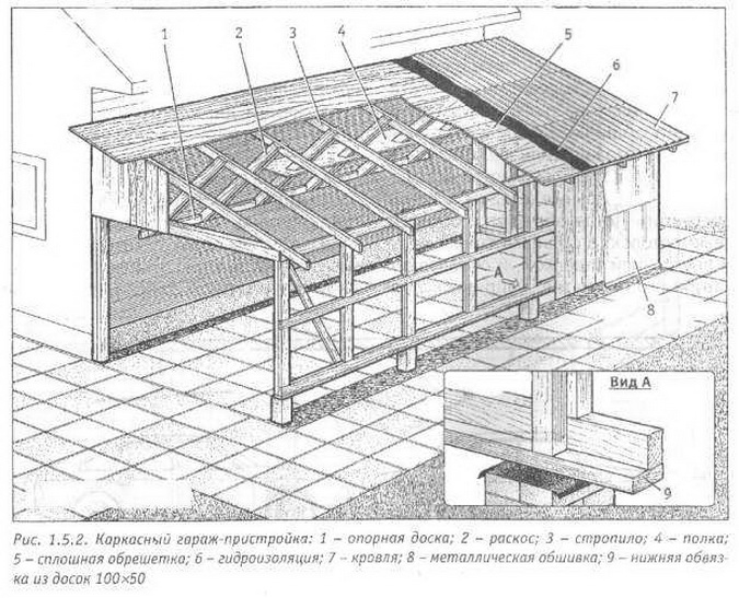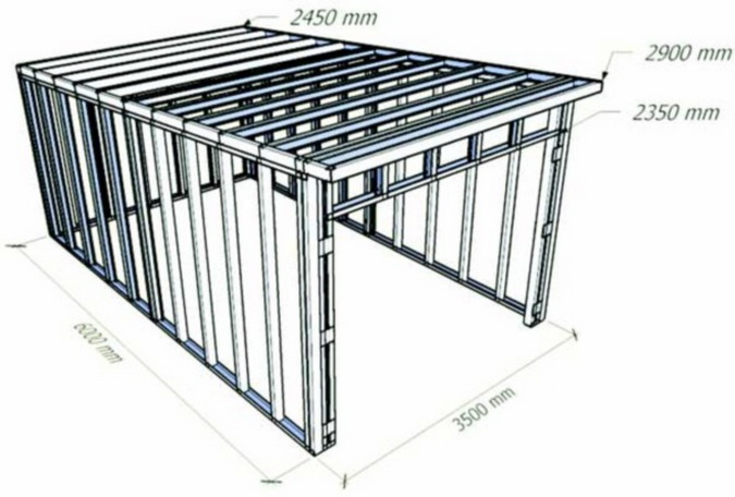 Перед тем как сделать навес к гаражу своими руками, необходимо сначала установить каркас, который должен состоять из достаточного количества балок-опор для кровельного материала, чтобы крыша не провисла и не растрескалась со временем.