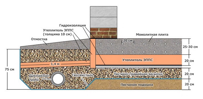 При обустройстве плитного фундамента необходимо тщательно заделать торцы плит, чтобы избежать скапливания там воды и снега. В идеале продольные отверстия, которые есть в каждой железобетонной плите необходимо полностью заполнить щебнем, гранотсевом или битым кирпичом.