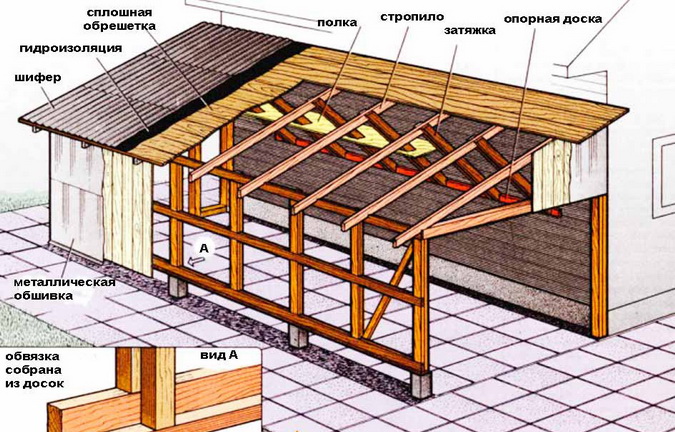 Крышу для простейшего гаража чаще всего делают односкатной, плоской, выполненной из бетонных панелей перекрытия, опирающихся на стены гаража. Двухскатную крышу выполняют по стропилам, опирающимся также на стены гараж. Она может быть выполнена из шифера. Каждый из этих вариантов имеет свои преимущества и недостатки.