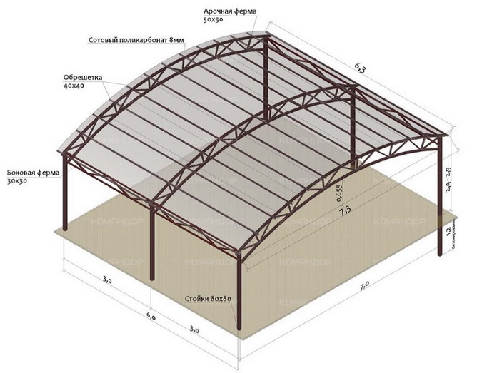 Когда каркас будет надежно установлен, можно приступать к работе с кровельным материалом. В качестве материала для навесной поверхности и для зашивки стен можно использовать поликарбонат.