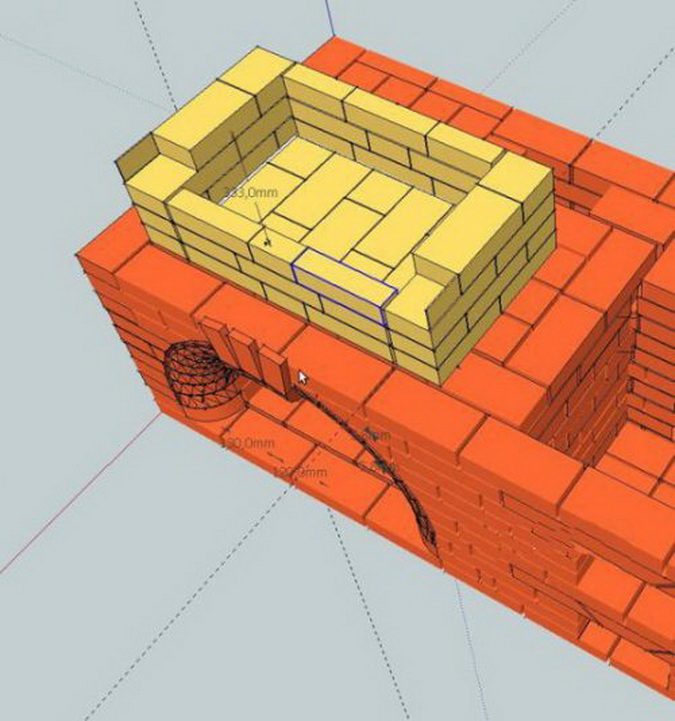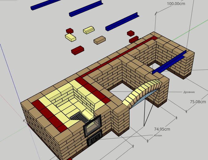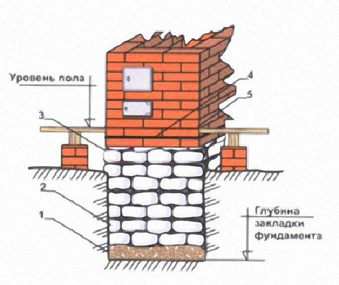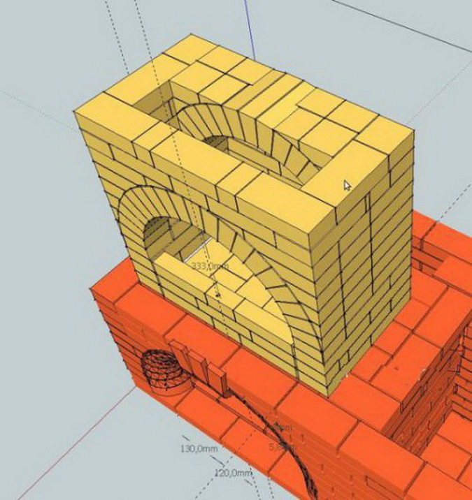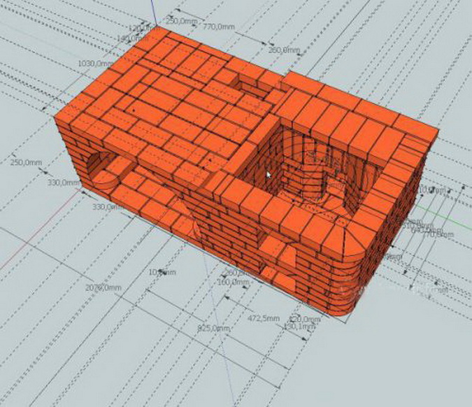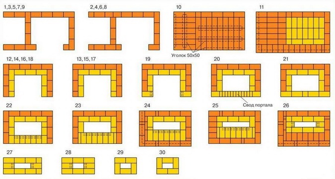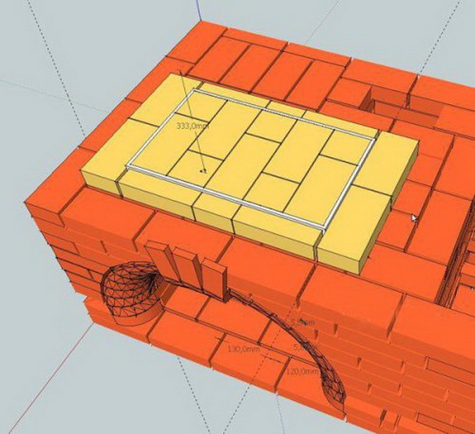 Ее возводят на отдельном ленточном основании, размещая к одной из торцевых стен печи-барбекю параллельно. В шестом ряде плинтусной стенки кирпичи кладут тычком.