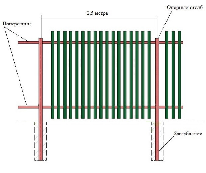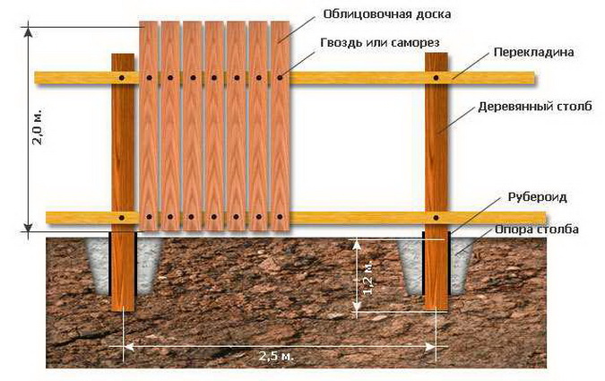 Перекладины делают из мягкой древесины (обычно хвойных пород) сечением 120 х 20 мм. Верхнюю перекладину прикрепляют так, чтобы отступ от верхушки столба составлял около 100 мм. Расстояние между грунтом и нижней перекладиной может быть больше.