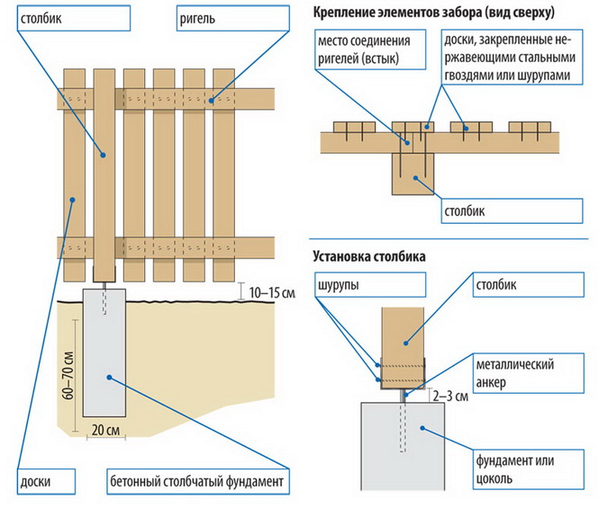 Верхний срез столбов и досок делают скошенным, чтобы дождевая вода и снег не задерживались и не впитывались в древесину. Для этих же целей можно использовать деревянные и пластиковые козырьки.
