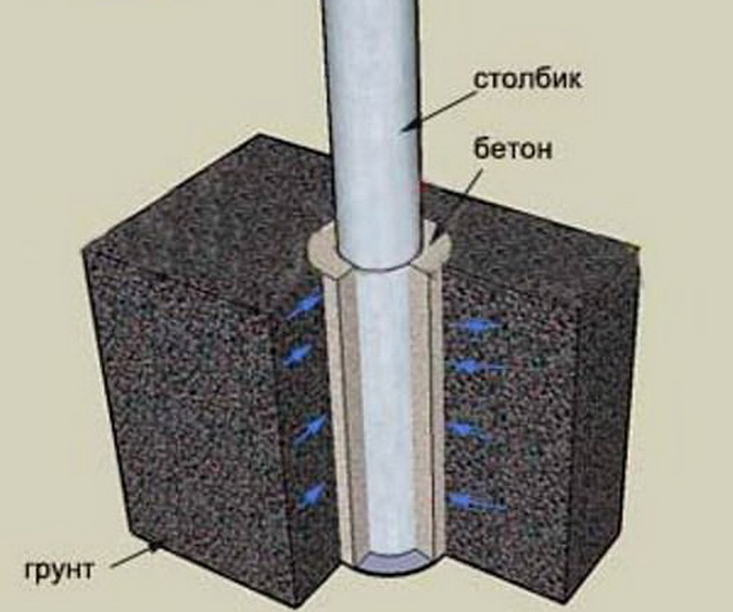 Подготовленные столбы заглубляют в землю не меньше, чем на четверть их длины. В зависимости от степени пучинистости и промерзания грунта глубина ям может превышать 1,5 м, но заглублять столбы более чем на треть не стоит.