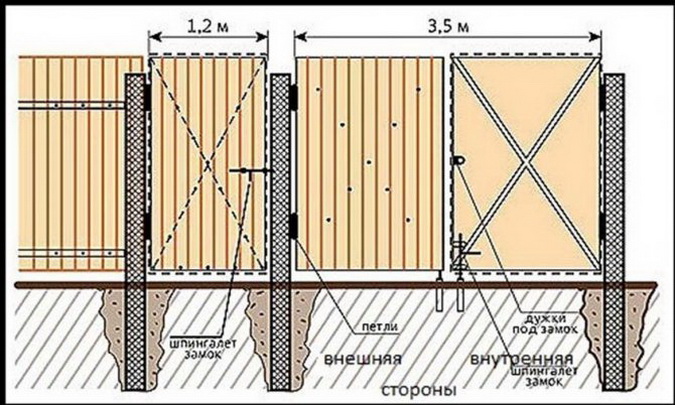 Створки ворот должны открываться во двор. В закрытом положении ворота удерживает засов, щеколда или пара шпингалетов, прикрепленных к нижней части обвязки створок и входящих в гнезда дорожного покрытия. Кроме того, такие же гнезда ставят на соответствующем расстоянии и по бокам проезда. В них фиксируют шпингалеты, когда ворота распахнуты, чтобы створки самопроизвольно не закрывались.