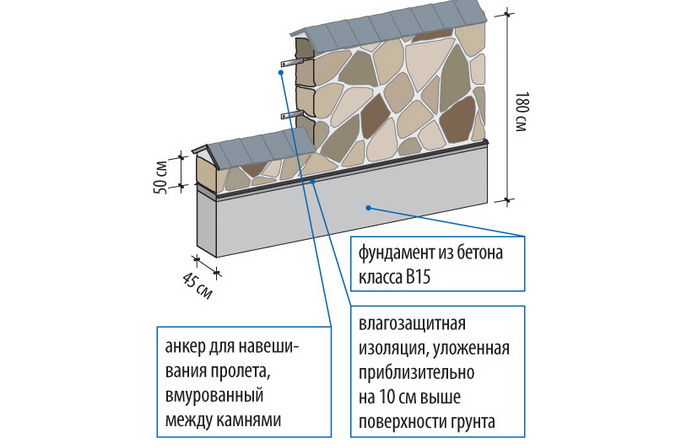 Ни бетонный, ни столбчатый фундамент под такую стену не закладывают. В неглубокую траншею кладут слой больших тяжелых камней, а на них укладывают первый ряд стены.