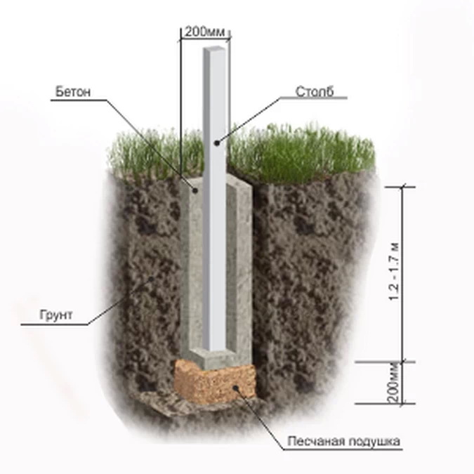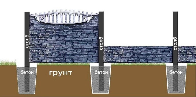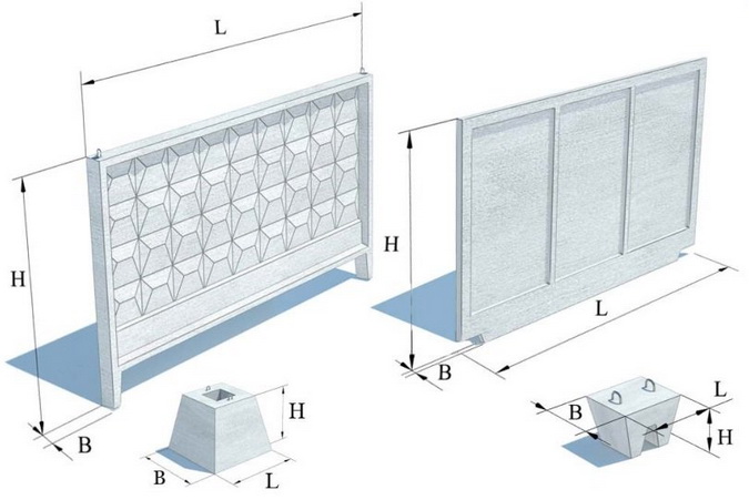 Существует два основных вида бетонных столбов для монтажа секций ограждения: цельные железобетонные столбы с пазами и наборные «камни для столбов». Железобетонные столбы с пазами имеют следующие размеры пазов: 0,5 м; 1,0 м; 1,5 м; 2,0 м; 2,5 м, соответствующие высоте ограждения. Нижняя часть столба без пазов бетонируется в грунт и имеет длину 0,8 м или 1,3 м.
