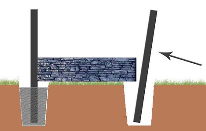 После этого процедура установки столба и секции повторяется: от столба отмеряют 2060 мм и снова бурят скважину, выполняют подсыпку, устанавливают бетонную секцию в паз предыдущего столба, устанавливают новый столб и надвигают его на секцию, после чего фиксируют столб бутом.