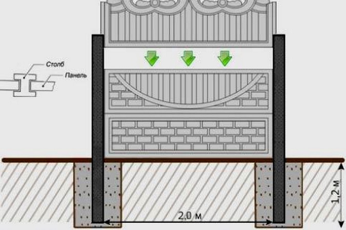 В такие же «стаканы» можно вставлять и столбы, между которыми крепят панели. Но чаще бетонные плиты крепят к столбам, заглубленным в почву не менее чем на 0,5 м. Такая конструкция является куда более надежной, чем предыдущие. С использованием столбов возводят так называемые еврозаборы и ограды из всевозможных ажурных бетонных плит.