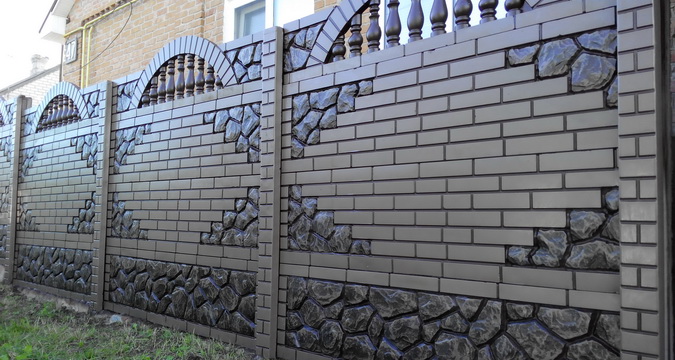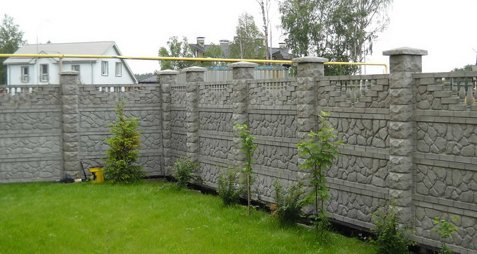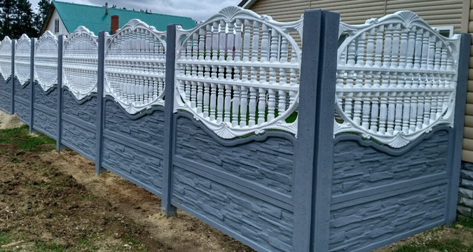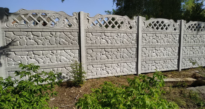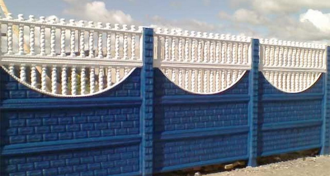 Бетонные панели нового поколения (еврозаборы) выглядят более привлекательно. Их изготавливают методом вибролитья из гранитного щебня мелкой фракции, песка и цемента с использованием стальной арматуры. Поверхность этих плит может имитировать кирпич, природный необработанный камень, плетение, деревянные доски, а технология изготовления позволяет окрашивать их в массе. Есть и ажурные панели, позволяющие воздуху свободно проникать за ограду. Поэтому так называемые еврозаборы стали популярны не только среди дачников, но и у владельцев городских усадеб.