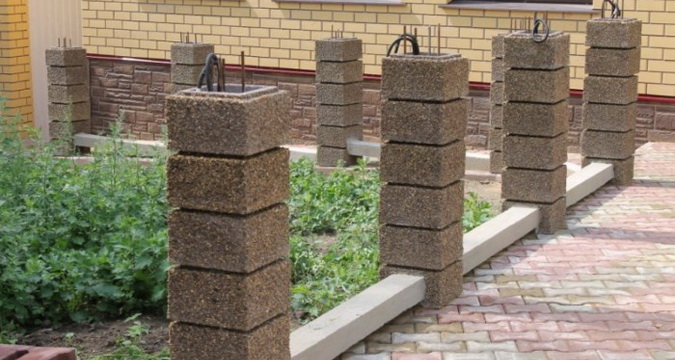 Столбы также собирают из отдельных блоков, которые имеют вид куба со стороной 200 мм, сквозным отверстием в центре и пазами с одной или нескольких сторон. Конечные блоки имеют по одному пазу, угловые и промежуточные — по два, а Т-образные стойки — по три паза. Для стен высотой более 600 мм в центральную пустотелую часть столбов необходимо заделать с помощью раствора арматурные прутки, металлический уголок или трубу. Кроме того, если стена имеет высоту более чем два блока, следует использовать и горизонтальное усиление кладки. Для этого в каждый горизонтальный растворный шов начиная с кладки третьего ряда включают проволочную арматурную сетку по всей длине пролета.