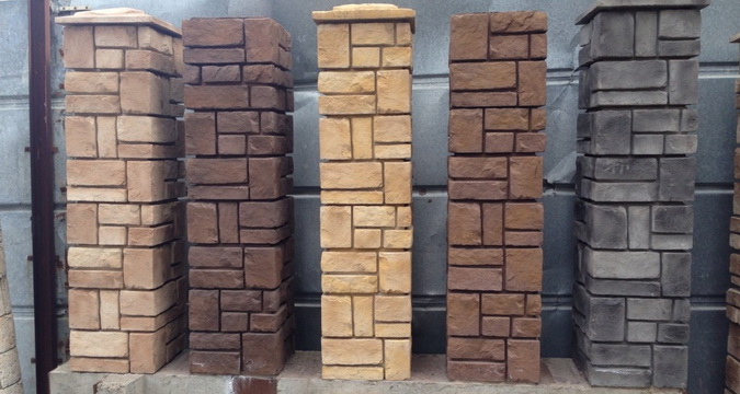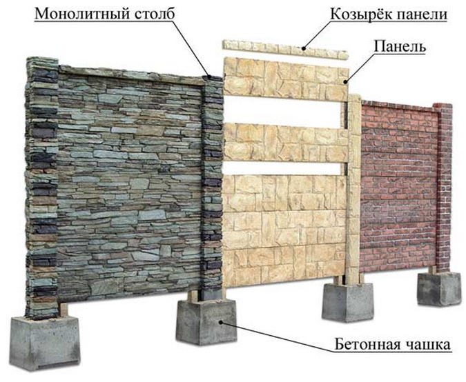 Наборные столбы, состоящие из бетонных элементов, имеют высоту, кратную высоте одной панели — 0,5 м, при этом общая высота ограждения может быть более 2,5 м. Для монтажа ограждения с наборными столбами из камней необходима основа (арматура, труба), которая бетонируется в грунт. Пустотелые камни набирают на основу, затем внутреннюю часть наборного столба заливают бетонным раствором. Сверху наборный столб закрывают бетонным оголовьем. Камни для столбов изготавливают с 2 пазами, с 1 пазом и без пазов (воротные столбы). В угловых столбах пазы могут быть расположены под углом 90° относительно друг друга. Наборные элементы столбов могут иметь как фактуру природного камня, так и гладкую поверхность.