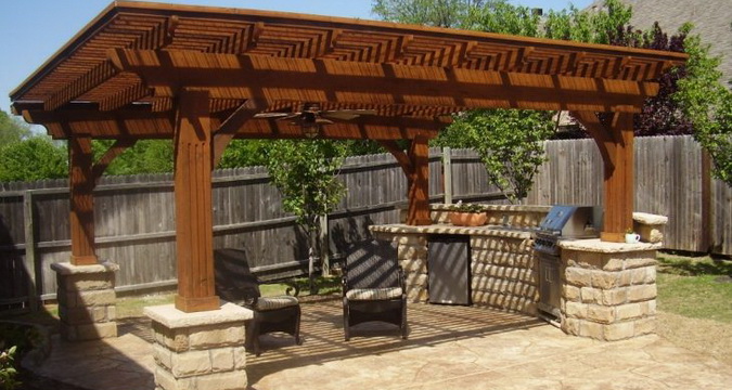 Для защиты от палящего солнца можно установить маркизы, перголы, зонты и тенты. Патио можно дополнить барбекю или дворовым камином, а при достаточных размерах — декоративным водоемом или фонтаном.