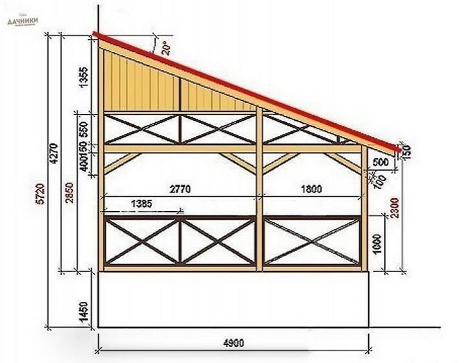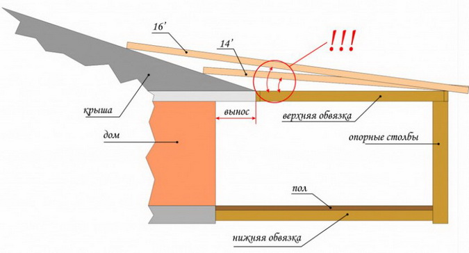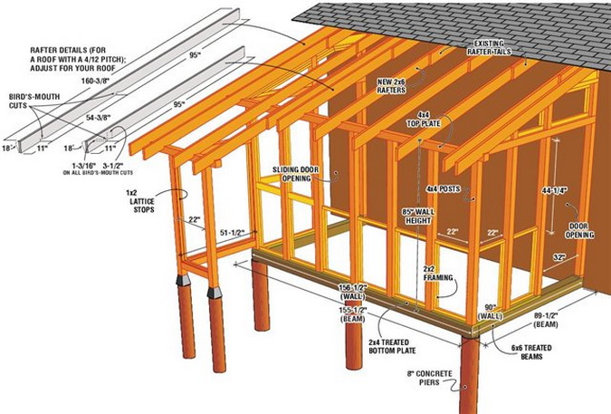 Передние стойки с помощью анкеров прикрепляют к отлитым из бетона фундаментным столбам. Каждая стойка представляет собой брус, сколоченный из двух досок сечением 95 х 45 мм (в этом случае он меньше будет растрескиваться, и коробиться, чем цельный). Задние стойки (95 х 45 мм) крепят к стене дома на дюбелях и шурупах. Сверху стойки соединены друг с другом верхней обвязкой, которую изготавливают из сдвоенных досок сечением 95 х 45 мм.