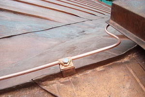 В качестве провода, по которому энергия молнии пойдет к заземлителю, лучше выбирать стальной (с сечением не меньше 10 мм2) или медный (с сечением не меньше 6 мм2). Чем толще провод, тем надежнее защита. Приемник соединяют с проводником с помощью сварки или болтового соединения, конец проводника обжимают наконечником. Кабель опускают по наружной стене дома, прикрепляя пластиковыми хомутами, которые монтируют дюбель-гвоздями. Желательно, чтобы стена была глухая, без окон, и располагалась напротив стены с входной дверью. Возле металлических элементов (лестниц, водопроводных и водосточных труб) проводник должен проходить на расстоянии не меньше 30 см.
