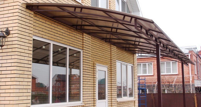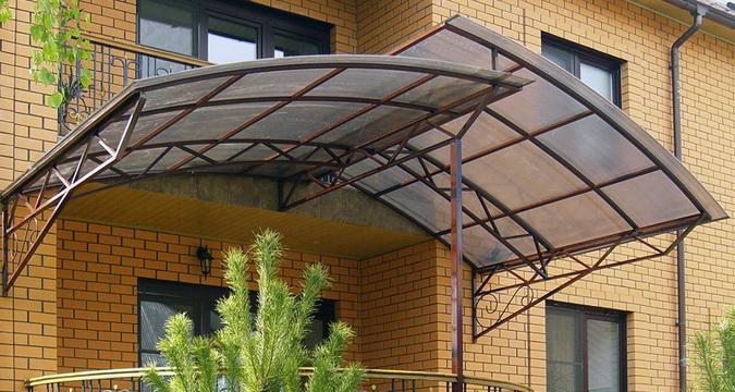 Материалов, из каких делают навесы и козырьки, довольно много — это сотовый поликарбонат, ПВХ, триплекс, стекло, профнастил, оргстекло, шифер. Но чаще всего кровлю козырьков у входа в дом и пристенных навесов делают из такого же кровельного материала, которым отделана крыша самого дома, то есть из остатков листового металла, неиспользованной керамической черепицы, металлочерепицы и т. п.