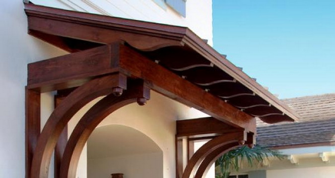 Весьма популярным материалом является и дерево, но за ним требуется регулярный уход, к тому же при выборе материала для козырька необходимо учитывать не только его конструктивные свойства, но и стилистическое решение, то есть соответствие стиля разрабатываемого навеса общему стилю фасада здания. Деревянное изделие подойдет не ко всем фасадам. Впрочем, то же относится и к металлу.