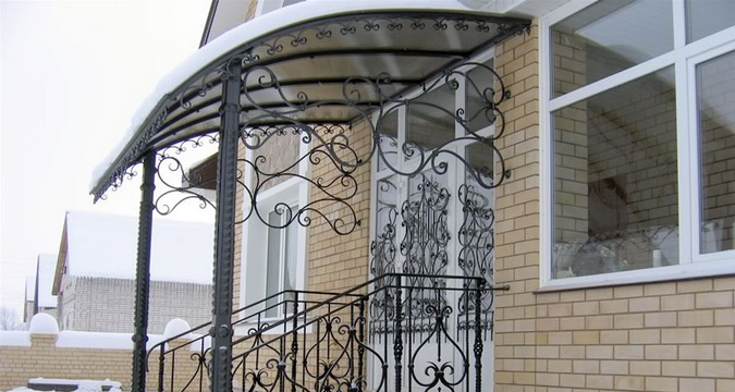 Полукруглый козырек. Такой козырек достойно украсит любой фасад. Для его создания вам потребуются профильные металлические трубы 20 х 20 мм для каркаса, квадрат 10 х 10, чтобы сделать фигурные вставки, и оцинкованный лист в качестве кровельного покрытия.