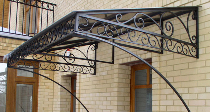 Шиферная крыша вполне надежна, но малоэстетична. Для кованых козырьков в качестве покрытия в основном применяют листовой металл.
