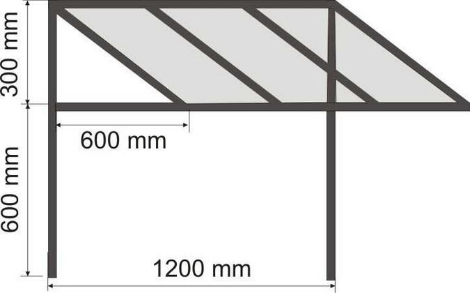 Простой односкатный козырек. Чтобы сделать простой металлический козырек с кровлей из поликарбоната своими руками, нужно выполнить эскиз будущей конструкции и рассчитать размеры. При расчете ширины козырька необходимо к ширине входной двери добавить минимум по 30 см с каждой стороны, чтобы навес не позволял дождю и снегу попадать на крыльцо.