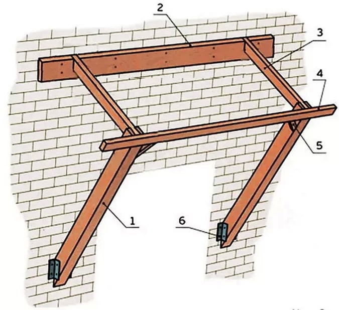 Готовую конструкцию фиксируют на стене в размеченных местах. Пристенную балку фиксируют посредством нержавеющих шурупов перед входом, а для крепления подкосов нужно использовать анкеры.