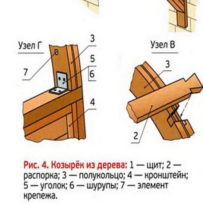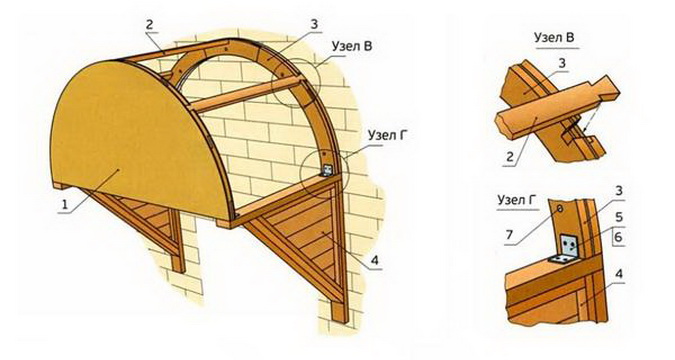 Фронтон козырька представляет собой сплошной щит полукруглой формы, а соединение деревянных деталей в ласточкин хвост обеспечивает удобство и простоту монтажа каркаса навеса.