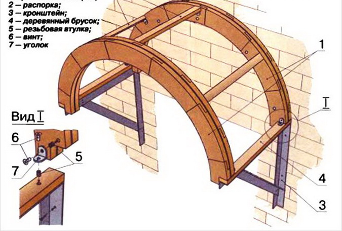 Вырезы на концах полукольца образуют уступы, обеспечивающие сопряжение элементов конструкции. Поэтому их размеры должны быть также увязаны с выбранным сечением деревянных брусков, закрепленных на кронштейнах.