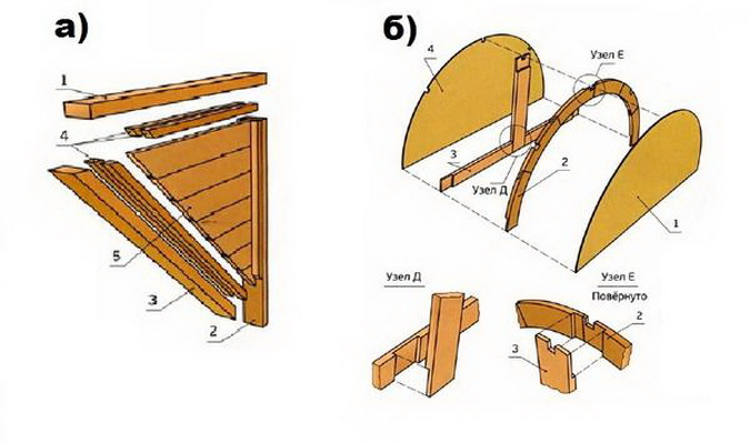 При аккуратном и точном изготовлении элементов сборка каркаса и по первому, и по второму варианту не сложна. Не доставит лишних хлопот и заключительная операция — монтаж кровли, поскольку к деревянным элементам конструкции (полукольцам, распоркам, несущим брускам кронштейнов) можно быстро и надежно прикрепить лист кровельной стали гвоздями или шурупами.