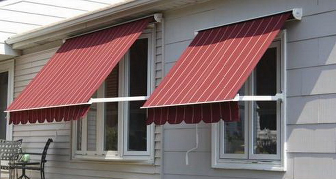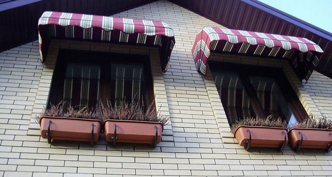 Самое простое исполнение навеса над окном — парусиновый тент. Эта относительно дешевая и легкосъемная конструкция подходит практически для любых домов, так как устанавливают ее только на 2—3 летних месяца. Ткань для тента можно подобрать с любым рисунком, который хорошо сочетается как с окружающим ландшафтом, так и с расположенными рядом постройками.
