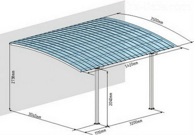 Ограждающие стенки по краям плиты, которые могут быть выложены из кирпича или готовых блоков, оштукатурены и отделаны аналогично стенам дома. Для крепления нижних концов стоек предусмотрены металлические подпятники и уголки. Из-за ступенчатости основания навеса стойки имеют разную длину, но верхние концы передних и пристенных стоек находятся на соответствующих горизонтальных уровнях.