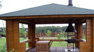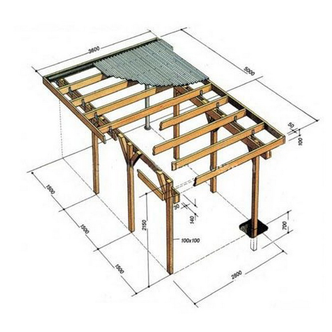 Все деревянные части навеса на даче к дому, устанавливаемого своими руками, необходимо предварительно обработать антисептиком. Плоскости элементов, прилегающих непосредственно к стене, целесообразно покрыть битумной мастикой (кузбасслаком), так как в этих местах наиболее вероятно возникновение очагов гниения. Деревянные пробки перед установкой их в стену должны быть обработаны соответствующим образом (пропитаны олифой или 10%-м раствором медного купороса).