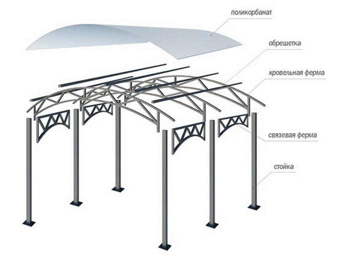 Для устройства кровли используют любой подходящий листовой материал: кровельное железо, шифер, профлист и т. д., однако следует учитывать, что эти материалы тяжелее поликарбонатных панелей.