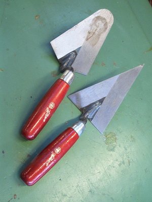 Главный инструмент для кладки стен в этом наборе — кельма, или мастерок. Кельма бывает разных форм и состоит из металлического полотна и деревянной либо прорезиненной ручки.