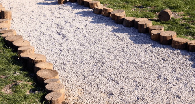 - если дорожка находится в «детской зоне» или зоне отдыха и используется только как игровой элемент, то крупные спилы или камни можно уложить выступающими островками над поверхностью насыпного материала дорожки (заглубление все равно потребуется, чтобы эти «островки» были устойчивыми).