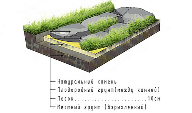 Если хочется, чтобы в швах между камнями живописно росла трава, то песок из швов наоборот выбирают или выдувают, а в образовавшиеся щели засыпают смесь грунта с семенами газонной травы. Помимо живописности, этот вариант хорош тем, что корневая система многих трав переплетается под камнями таким образом, что служит дополнительным армированием дорожки.
