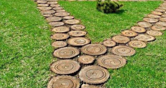 Плоские поперечные спилы деревьев в зависимости от их диаметра могут быть уложены один за другим (тропинка шириной в один спил) или использоваться как элементы сплошного мощения дорожки.