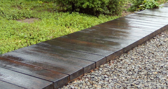 Любые деревянные элементы в конструкции дорожек должны быть предварительно обработаны специальным составом против гниения. Укладывают их на песчано-гравийное основание, при необходимости подбивая киянкой по высоте.